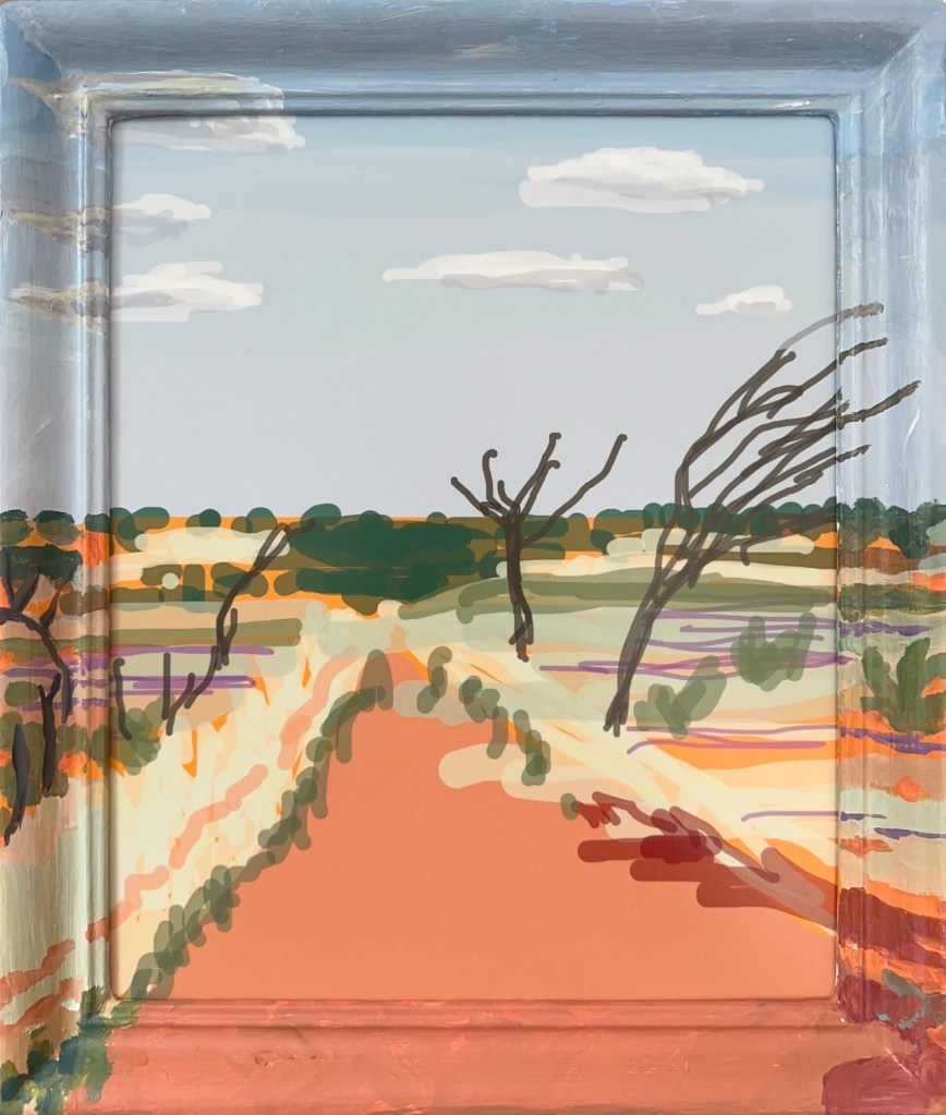 Driving to Yorkes, 2025. iPad finger drawing printed on metal, acrylic paint on recycled frame. 44cmx36cm. $480Driving on the Stuart Highway, 2025. iPad finger drawing printed on metal, acrylic paint on recycled frame. 43cmx35cm $480Kangaroo Island from Willyama Beach, 2025. iPad finger drawing printed on metal, acrylic paint on recycled frame. 47cmx39cm $480 SOLDColors of Marion Bay, 2025. iPad finger drawing printed on metal, acrylic paint on recycled frame. 37cmx31cm $480Kwartatuma – Ormiston Pound, 2025. iPad finger drawing printed on metal, acrylic paint on recycled frame. 65cmx54cm $750Driving up North, 2025. iPad finger drawing printed on metal, acrylic paint on recycled frame. 37cmx31cm $480 SOLDDriving near Alice Springs, 2025. iPad finger drawing printed on metal, acrylic paint on recycled frame. 55cmx40cm $650Colors of Pachoota Range, 2025. iPad finger drawing printed on metal, acrylic paint on recycled frame. 61cmx28cm $480Mike’s Olive Tree, Malta 2025. iPad finger drawing printed on metal, acrylic paint on recycled frame. 61cmx50cm $720 SOLDBudgie Explosion, Yarreteke – Redbank Gorge, 2025 iPad finger drawing printed on metal, acrylic paint on recycled frame 61cmx35cm $680 SOLDAt Ellery Creek Big Hole – Udepata, 2025 iPad finger drawing printed on metal, acrylic paint on recycled frame 38cmx31cm $480 SOLD Colours of Yarretyeke – Redbank Gorge, 2025. iPad finger drawing printed on metal, acrylic paint on recycled frame. 57cmx26cm $650Walking Larapinta (on the way to Hilltop), 2025 iPad finger drawing printed on metal, acrylic paint on recycled frame and cardboard. 65cmx34cm. $680 SOLDCollected, red. 2025. iPad finger drawing printed on metal, acrylic paint on recycled frame and cardboard. 25cmx30cm $240 SOLDCollected, Orange.2025. iPad finger drawing printed on metal, acrylic paint on recycled frame and cardboard. 25cmx30cm $240Collected, Yellow 2025. iPad finger drawing printed on metal, acrylic paint on recycled frame and cardboard. 24cmx31cm $240Collected, green. 2025. iPad finger drawing printed on metal, acrylic paint on recycled frame and cardboard. 25cmx30cm $240Collected, Blue. 2025. iPad finger drawing printed on metal, acrylic paint on recycled frame and cardboard. $240 Collected, Purple. 2025. iPad finger drawing printed on metal, acrylic paint on recycled frame and cardboard. 28cmx33cm $240